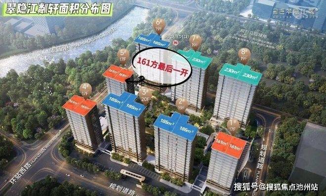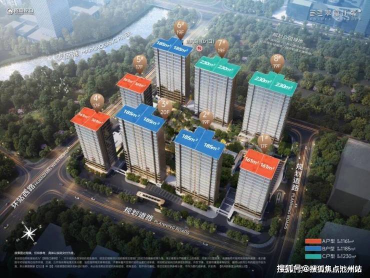 翠隐江粼体量规模中等,共计278户,由8幢17-20F高层组成,主力户型有三——