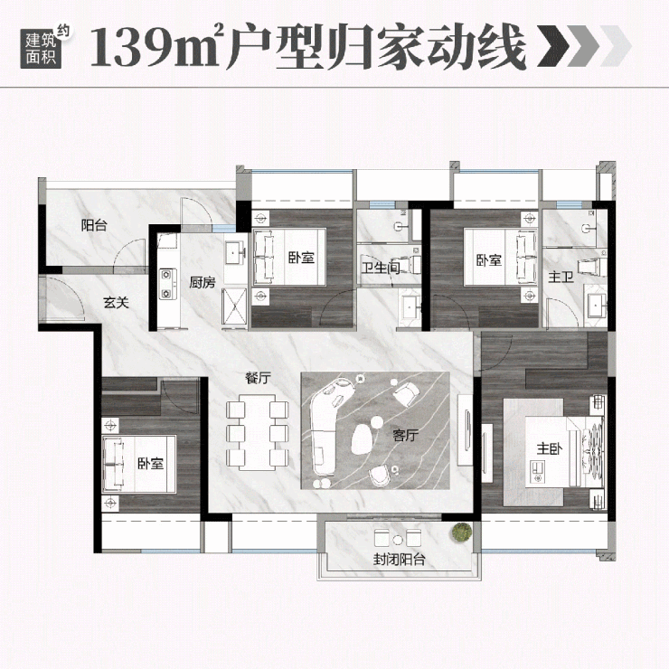 139㎡ 4+1房2厅2卫,约9㎡灵动空间,L型尊崇入户+归家双动线,约7m长都荟宽厅,南向通透四开间,灵动次卧,预留横竖双厅+西厨创意改造,全屋80cm阔景飘窗升级。