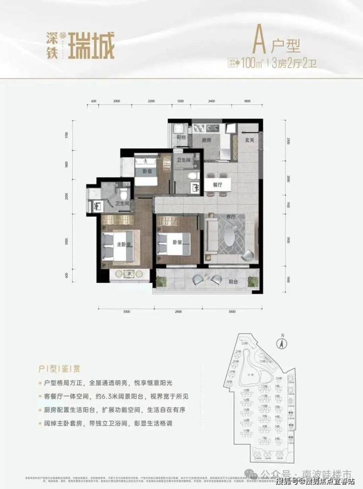 100㎡的3房2厅2卫,A户型,设计的是经典竖厅格局,进门入户玄关,客厅3.5米开间,LDKB一体化设计,动静分区,3个卧室分别做到了主卧12㎡/次卧7.57㎡/次卧6.01㎡(实测面积,去掉墙体),客厅连接次卧出6.3米长的阳台,L型厨房还带1个生活阳台,卫生间干湿分离,得房率约:75.76%(不含赠送),西南或东南朝向。