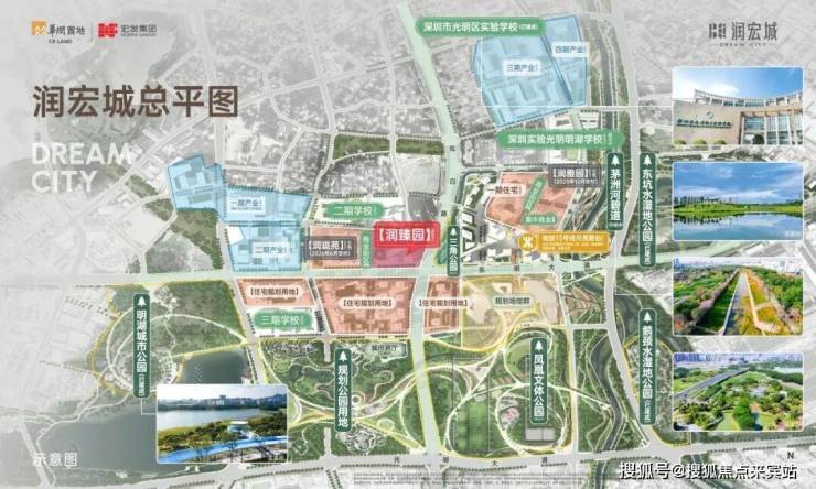 华润润宏城,位于光明区凤凰街道塘尾社区,总占地面积约195万㎡ ,总建筑面积约382万㎡,住宅面积高达172.44万㎡,分多期多地块开发,其中一期就分4个地块开发,前期入市的是润雅园已经基本售罄,还剩少量4房在售,这次润臻园就是1期其中一个地块,后面还有二期三期,另外产业配套也分4期开发打造,还规划有3所九年制学校、2所18班幼儿园,3所12班幼儿园,3所9班幼儿园。
