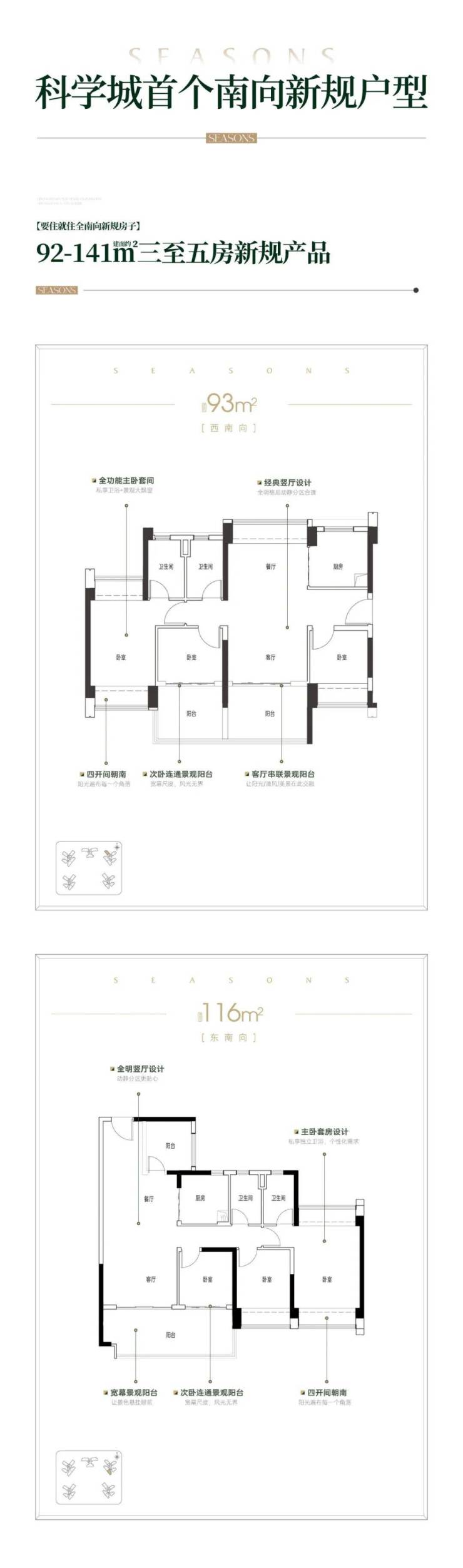 项目主推92-141㎡三至五房,全南向设计,主打高使用率,最高可以达到118%,关键词:110%+使用率、2梯3-5户、全南向。