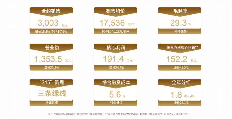 报告期内,世茂集团的营业额为1353.5亿元,同比增长21.4%;毛利为396.7亿元,同比增长16.2%;毛利率为29.3%,核心利润为191.4亿元,同比上升24.9%,股东应占核心利润152.2亿元(包含物业股权处置收益),同比上升45.2%,盈利能力稳步提升。