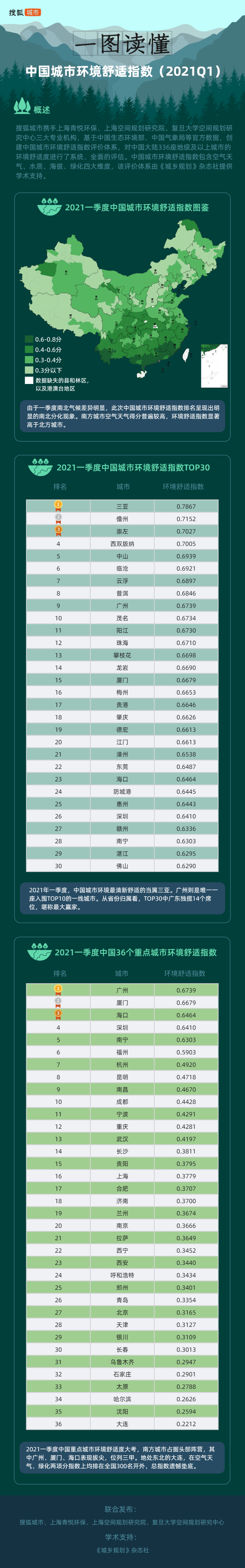 搜狐城市主编赖颢宁现场发布的报告结果显示,2021一季度,“中国十大环境舒适之城”依次是三亚、儋州、崇左、西双版纳、中山、临沧、云浮、普洱、广州和茂名。