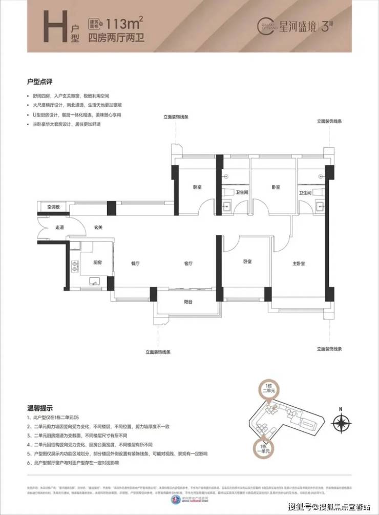 113㎡的4房2厅2卫,设计的是横厅南北通透格局,进门独立入户玄关,主卧大套房设计,三开间朝南,全屋飘窗设计,客厅采光面特别靓,得房率76%(不含赠送),阳台主朝东南向。
