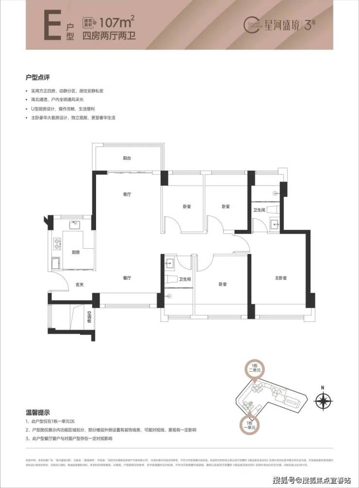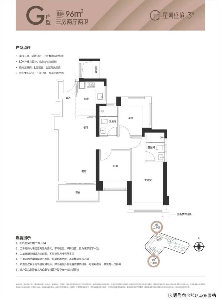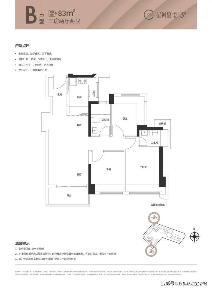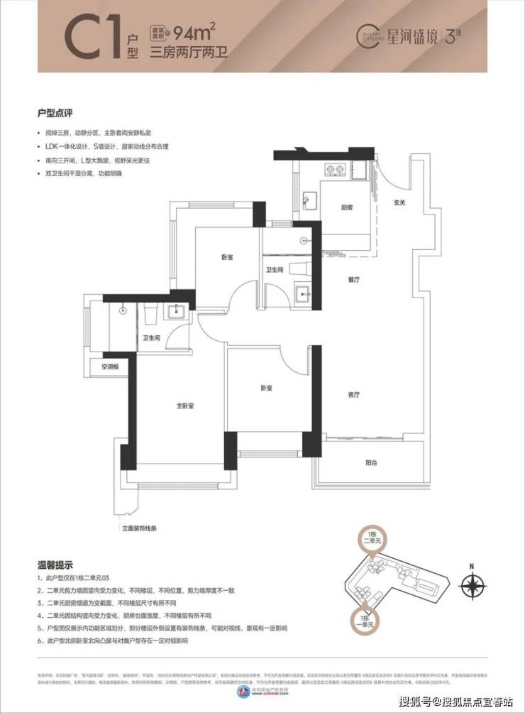 (1栋1单元01/02户型),设计的是竖厅格局,创新LDK一体化餐客厅,S墙设计预留冰箱位,三开间朝南,次卧270度环幕设计,U型厨房,卫生间干湿分离,得房率80.07%(不含赠送),全部西南朝向。