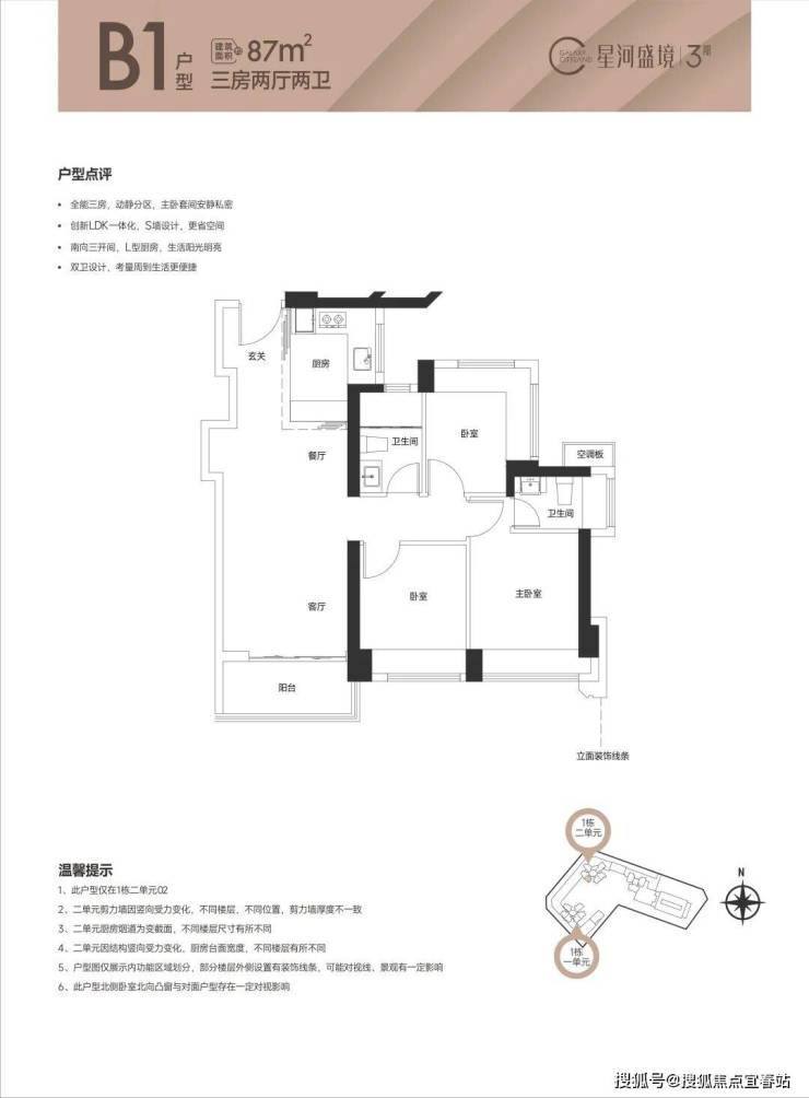 87㎡的3房2厅2卫(1栋2单元01/02户型),设计的是竖厅格局,创新LDK一体化餐客厅,S墙设计预留冰箱位,三开间朝南,次卧270度环幕设计,U型厨房,卫生间干湿分离,得房率76%(不含赠送),全部西南朝向。
