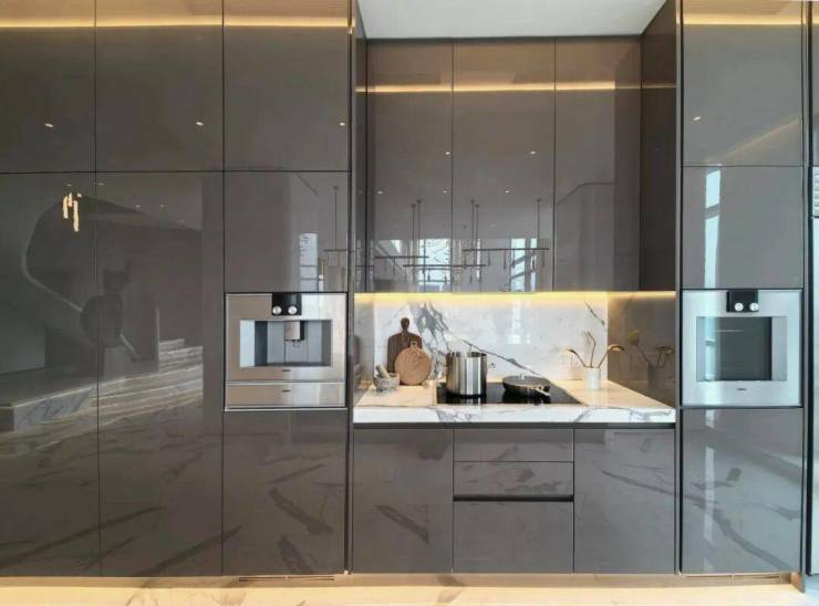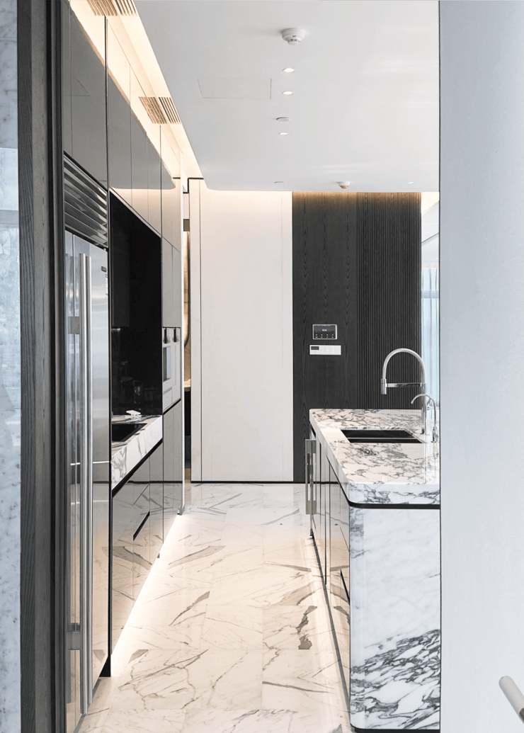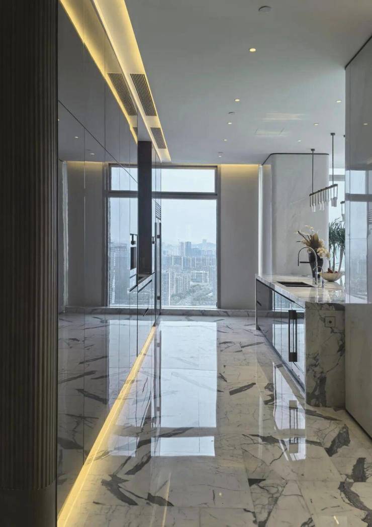 岛台采用苔原灰色亮光烤漆门板的中岛厨房,被精心布局于室内柱体与墙面之间,一字排开与起居空间和开阔的城市天际线对望。门板柔和的暖灰色,为空间沉淀一份温柔和沉稳。