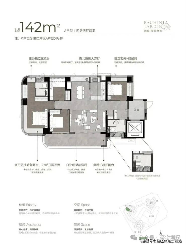 专梯入户:每户独享电梯厅,保障私密尊贵感,同时可拓展为玄关收纳区。