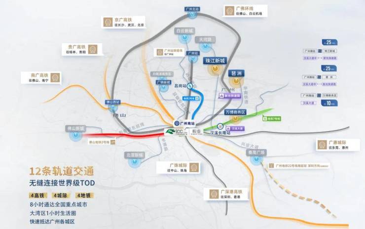 峻銮与广州南站直线距离在500米黄金范围内,占领了中心交通枢纽高地,广州南站的路网建设密度超乎所有人想象——12轨道交汇,涵盖4条地铁、4条高铁及4条城际铁路,30分钟纵享主城繁华生活,1小时大湾区通勤,8小时面向全国。