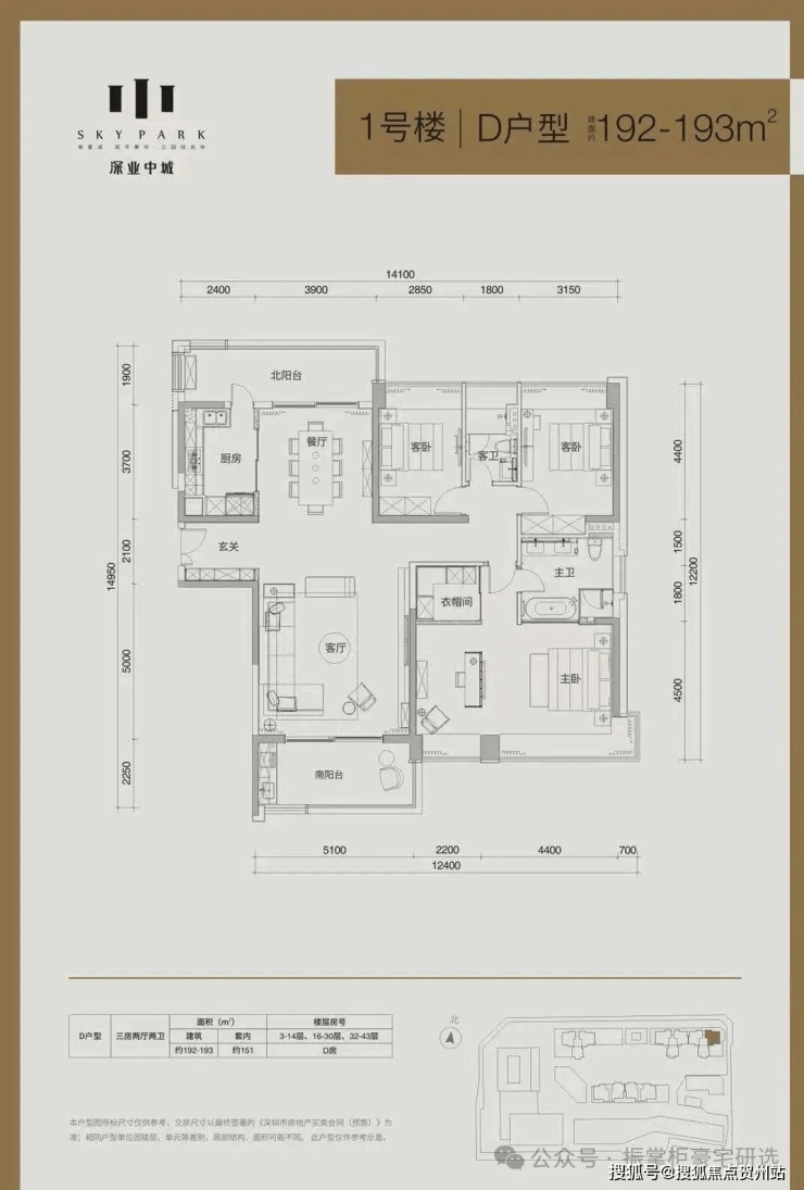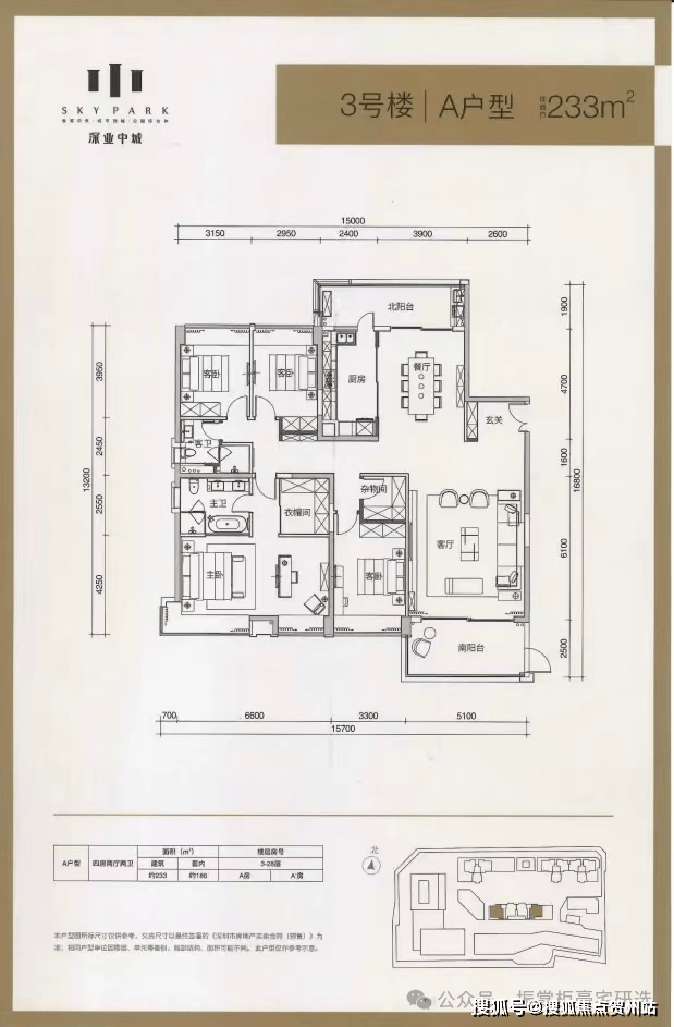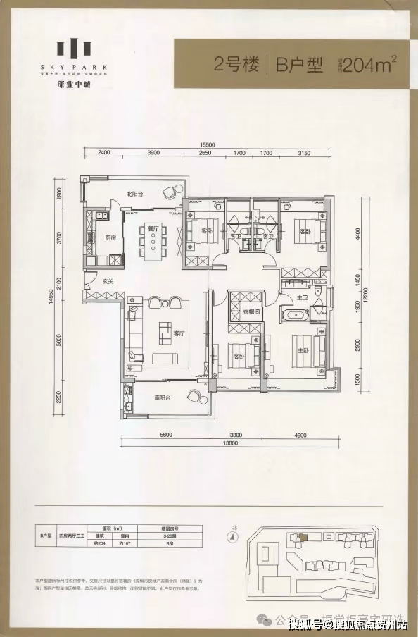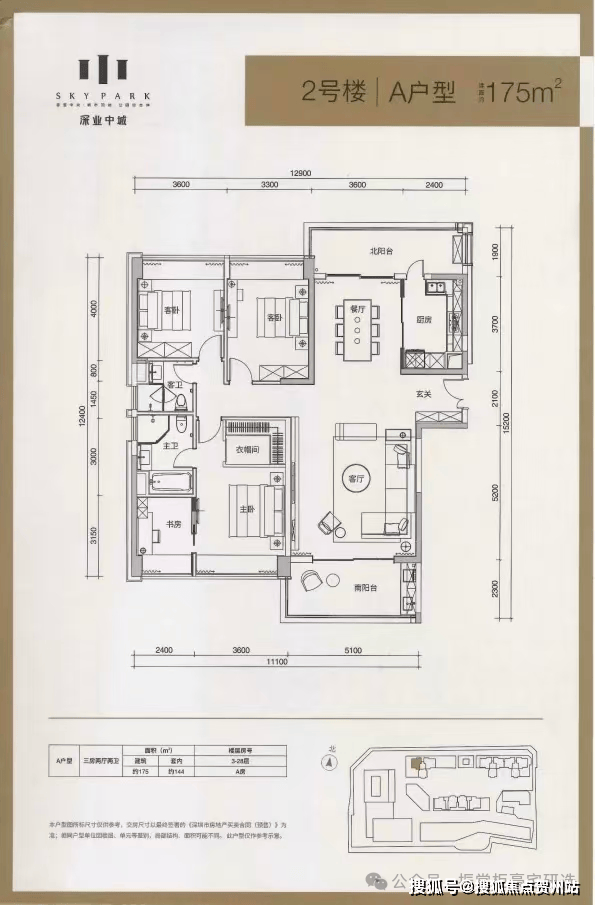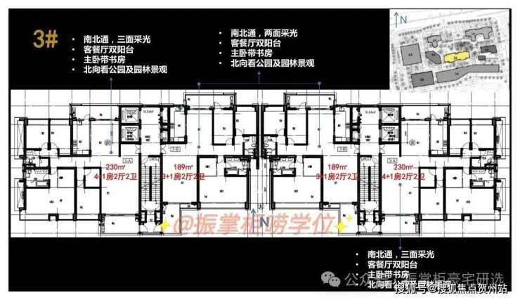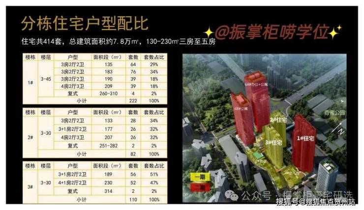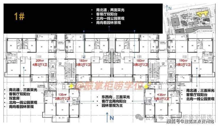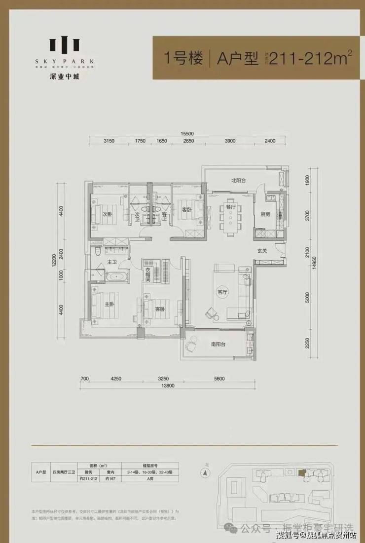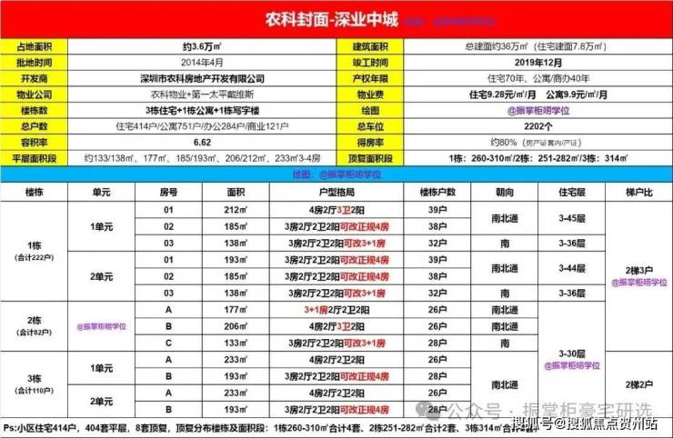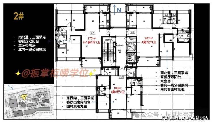 ·177㎡3+1房(A 户型):西边户三面采光,南北通透,厅出双阳台,3+1房可做正规4房2卫,南向看小区园景,北向看香蜜公园的景观视野,采光和视野会被西南侧6A#写字楼和公寓遮挡部分,隐私性和采光会有影响;