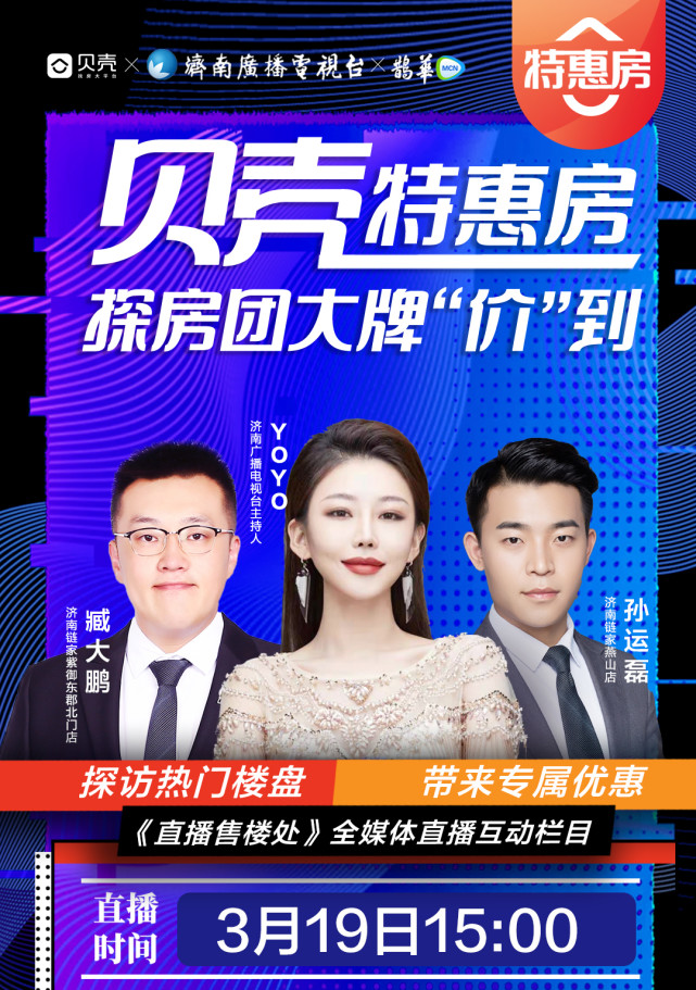 由济南广播电视台与贝壳找房济南站联合打造的济南首档全媒体直播互动栏目——《直播售楼处》,将于3月19日15点震撼开播!该栏目是一档集专业性、娱乐性、互动性于一体的直播栏目,由济南广电颜值主播官方代言,与贝壳特惠房推荐官一起,直播解析品牌楼盘排名前列线,带给购房者专业市场分析、权威买房攻略以及特别特惠信息,提供购房者切实的实惠与便利!