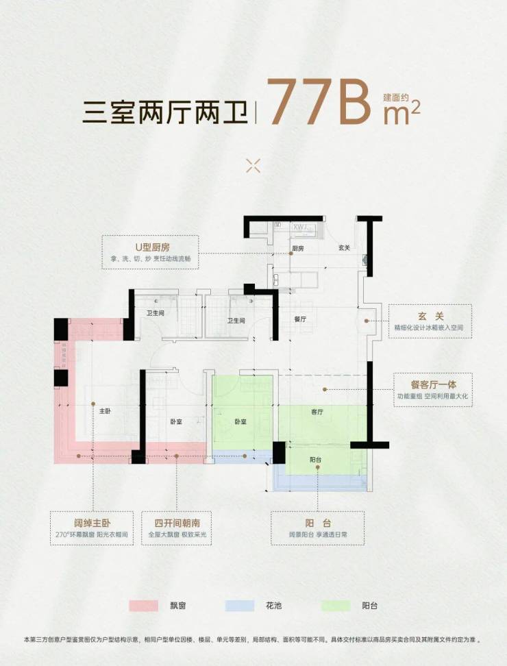 建面约77-135㎡三四房,四面宽南向,三房(最高)享约5米客厅,新规产品约127-137%高使用率,(但实际看了,感觉并没有宣传的那么高使用率)同面积不同户型,贴心打造多种人居空间。