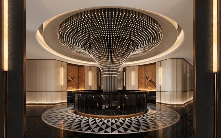 包括:选用博物馆级环球石材,打造酒店式社区落客区;社区迎宾大堂(层高约9米);四季风雨连廊;单元豪华大堂;超配车库入口;车库地下豪华大堂;精装车马厅;臻享高定生活入户礼遇,塔尖圈层生活境界。