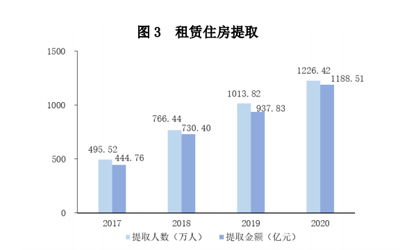 2020 年,支持1226.42万人提取住房公积金1188.51亿元用于租赁住房,分别占当年提取人数、提取金额的20.16%、6.41%。 支持0.51万人提取住房公积金2.11亿元用于老旧小区改造,分别占当年提取人数、提取金额的0.01%、0.01%。