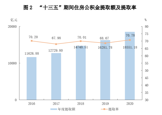 “十三五”期间,住房公积金提取额累计73930.14亿元,年均增长12.39%。