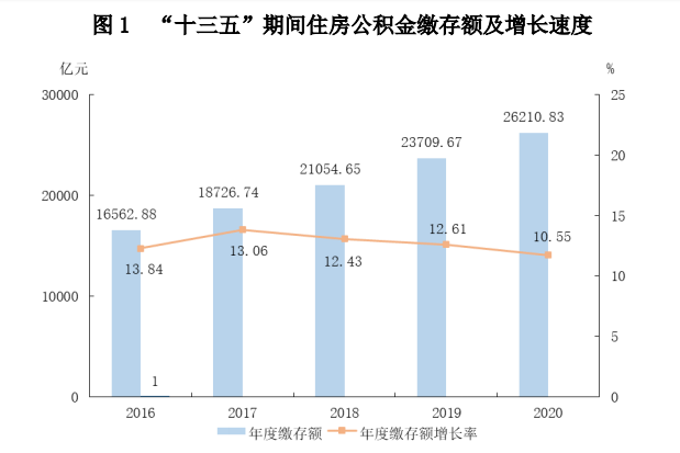 “十三五”期间,住房公积金缴存额累计106264.77亿元,年均增长12.16%。“十三五”期末缴存余额比“十二五” 期末增长 79.57%。