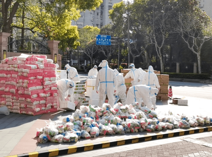 图:世茂服务物业工作人员在社区门口配送生活物资