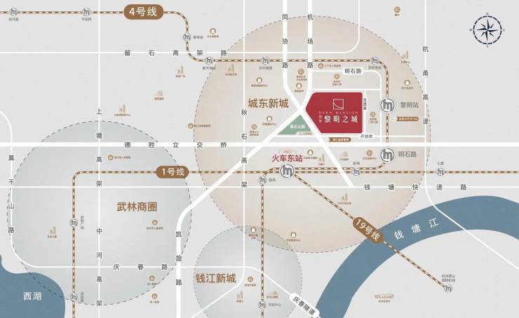 地铁4号线黎明站,仅400米之遥,三站即达杭州东站,七站穿梭钱江新城核心,一城繁华,尽在掌握。四通八达的交通网络,让您的出行无界,与世界无缝连接。