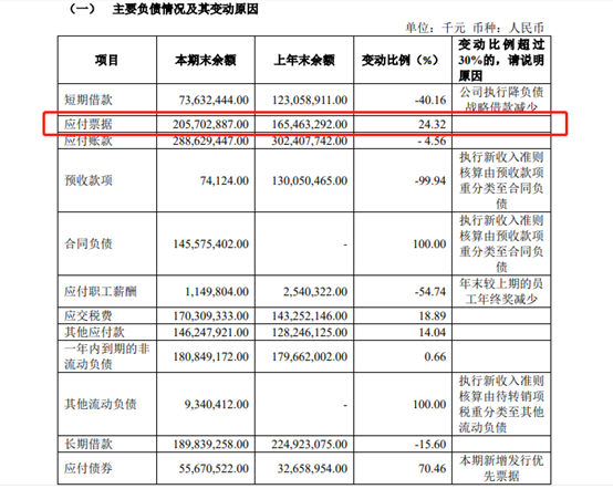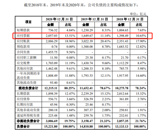 在恒大2021年面向合格投资者公开发行公司债券(排名前列期)募集说明书显示,截至2018年末、2019年末及2020年末,恒大应付票据分别为1387亿元、1650亿元和2057亿元,均为一年内到期,主要为商业承兑汇票。到2020年,其应付票据占总负债的比例已经达到13.51%。