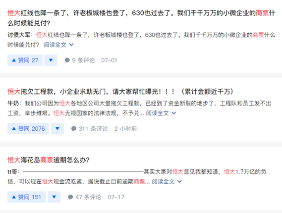 但供应商们不一样,他们坐的是“跳楼机”。在知乎、微博搜索“恒大商票”,能看到满屏的焦虑: