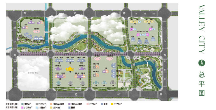 约160亩上璟公园,定位“城东首个儿童成长主题公园”,以1条约1.5km溪谷河道+1条约1km蓝花楹大道+3大归家公园绿道+6大公园直连社区,构成大盘生活的物理场域。