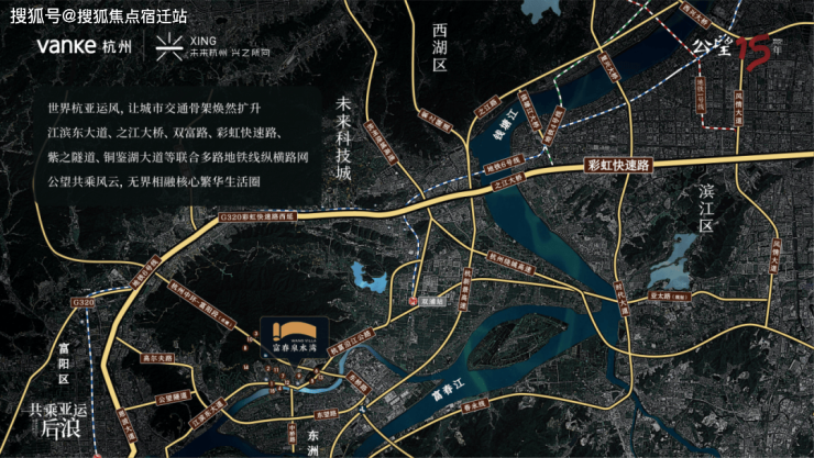 通过江滨东大道、彩虹快速路等便捷交通网络,与市中心无缝对接,仅需约20公里车程即可畅达滨江区,轻松融入杭州半小时经济生活圈。