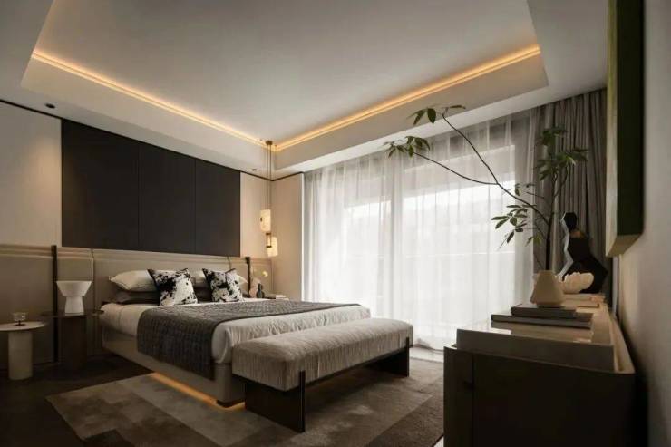 建筑坡顶采用大坡顶与小坡顶结合,屋面采用瓦片材质与金属钩边进行铺装,青瓦交叠,如远山淡墨。立面局部采用仿石铝板进行装点,在檐下空间与建筑装饰上,点缀了橡木灰金属材质,形成克制且奢华的冲突美。