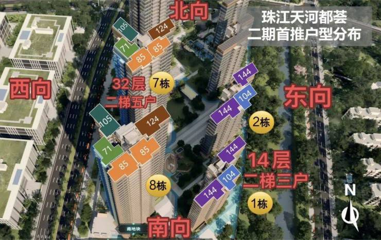二期户型:32层塔楼为71-85-105-124平,14-15层板楼为104-144平