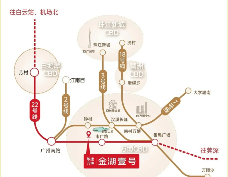 ◎【双地铁交汇】22号线(已开通)及26号线(规划中)双地铁交汇,约800米市广路地铁站, 1站番禺广场、2站万博中心,3站琶洲CBD、4站珠江新城。