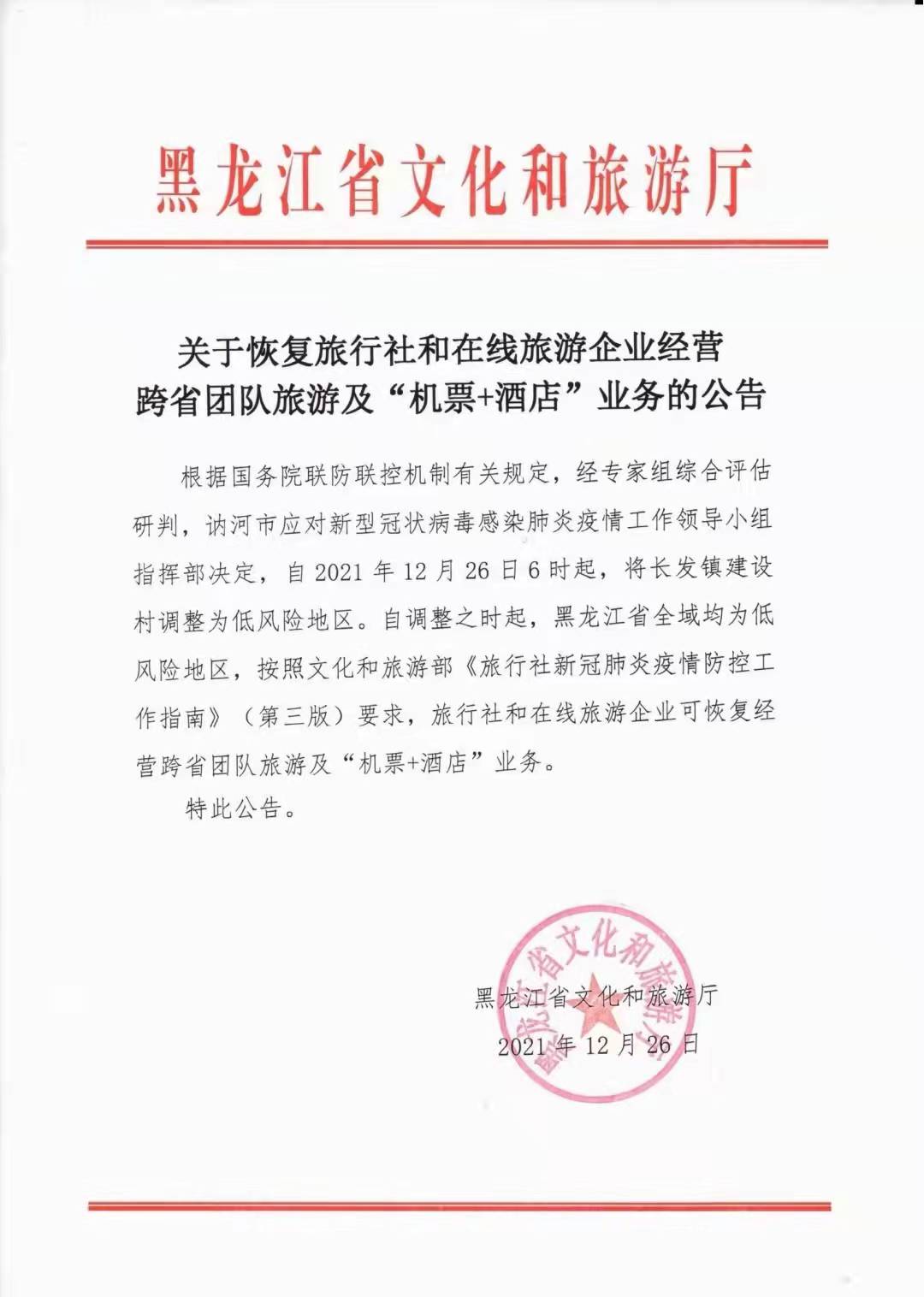 据黑龙江文旅厅消息,根据国务院联防联控机制有关规定,经专家组综合评估研判,讷河市应对新型冠状病毒感染肺炎疫情工作领导小组指挥部决定,自2021年12月26日6时起,将长发镇建设村调整为低风险地区。自调整之时起,黑龙江省全域均为低风险地区,按照文化和旅游部《旅行社新冠肺炎疫情防控工作指南》(第三版)要求,旅行社和在线旅游企业可恢复经营跨省团队旅游及“机票+酒店”业务。