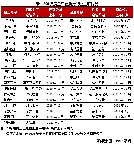 TOP100有33家关联物管公司已上市。2018年以来物业管理公司上市热度持续, 2020年由于新冠疫情让物业得到更多重视,在物业板块估值较高的情况下,房企拆分物业管理公司IPO的步伐明显加快。且在“三道红线”下,分拆物业也成为房企改善财务的办法之一,通过股权融资的方式,有助于降低企业的负债水平,因此不少房企将物业管理分拆视为一种去杠杆、加权益的手段。作为房企有天然优势的多元化方向,从2014年彩生活上市以来,截至目前TOP200房企中已经有37家关联物业公司上市,其中TOP100房企有33家关联物业公式上市,TOP50房企中有25家。2021年物业上市持续发力,星盛商业1月26日登陆港交所,此外新希望服务、德信服务及禹佳生活等已经递交招股说明书,融信服务、中骏集团下所属物管公司世邦泰和、东原仁知服务等也有2021年上市计划。万科云、富力物业等未来或将会考虑上市。