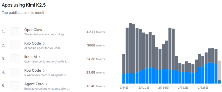 但从该平台整个2月看,K2.5依然是OpenClaw调用量最多的模型,规模超1.2万亿Tokens,占比近30%,OpenClaw亦是M2.5和DeepSeek V3.2的第二大Token消耗应用。