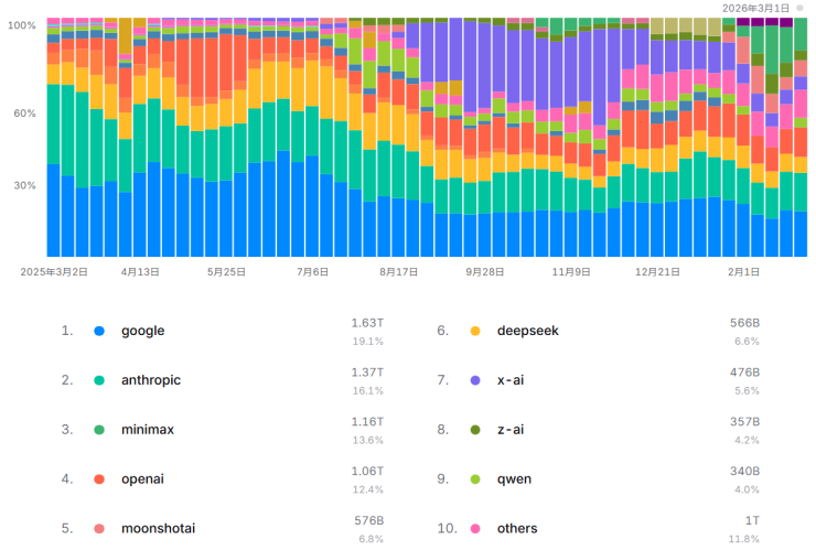 如今单列的中国大模型企业又多出MiniMax、月之暗面和智谱等,合计占比提升到三分之一左右,并打破美国的寡头垄断格局,谷歌和Anthropic的份额受到挤压已腰斩。