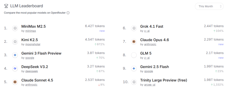 其中M2.5以6.42万亿Tokens的调用量登顶第一,K2.5环比暴增十倍,DeepSeek V3.2实现近90%的增长,GLM5位于第八,阶跃星辰新开源模型Step3.5 Flash快速冲到第12名。