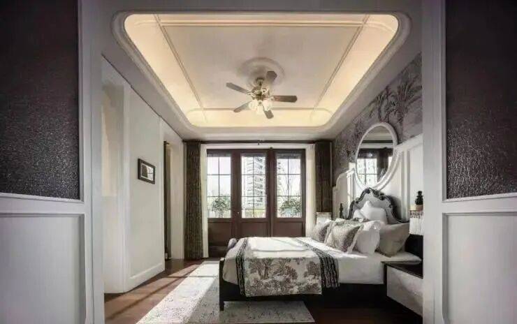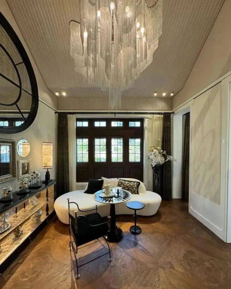 利用本身超大面宽属性,做出非常大的落地窗,这些窗又用很多传统的线条将它进行分割装饰,连续方格长窗,既保障了室内通透采光,又还原了花园别墅的线条美感与风情。