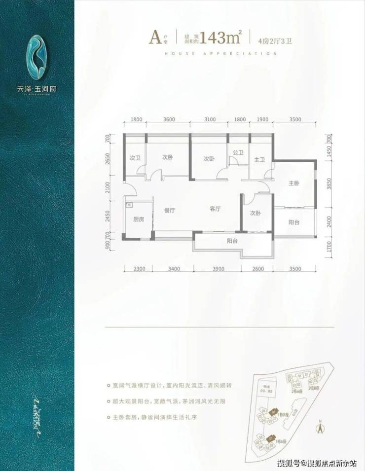 A户型-143㎡-4房2厅3卫,设计的是横厅南北通透格局,客餐厅开间7.3米,双主卧套房设计。4个房间宽度分别为3.6/3.5/3.1/2.6米,L型厨房,得房率:91.1%(包含赠送),超大观景阳台6.5米长,主朝东南朝向,看茅洲河景观。