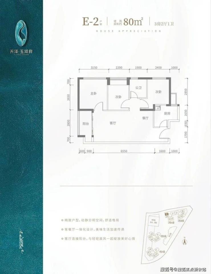 E2户型-80㎡-3房2厅1卫,2栋A座05户型,设计的是竖厅格局,客厅3.5米开间,餐客厅一体化,3个房间宽度分别为3.15/2.4/2.2米,L型厨房,得房率:83.7%(包含赠送),阳台进深1.5米,朝西南向。