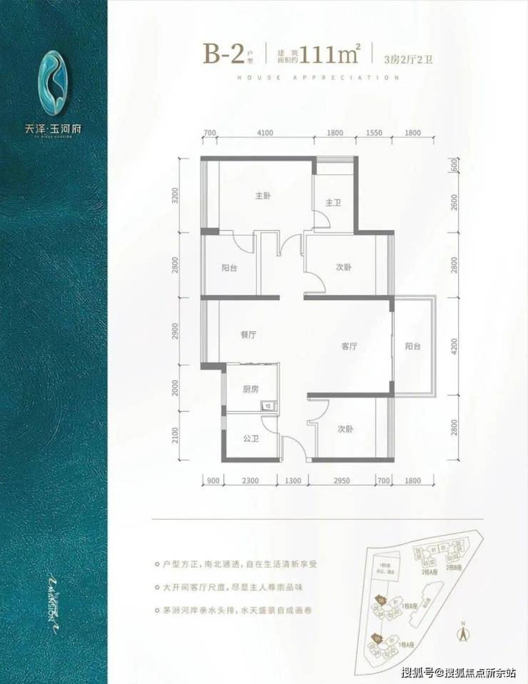 B2户型-111㎡-4房2厅2卫,设计的是竖厅南北通透格局,客厅4.2米开间,全屋飘窗设计,4个房间宽度分别为3.2/2.8/2.8/2.8米,L型厨房,得房率:94.6%(包含赠送),阳台进深1.8米,主朝东北朝向,看花园景观。