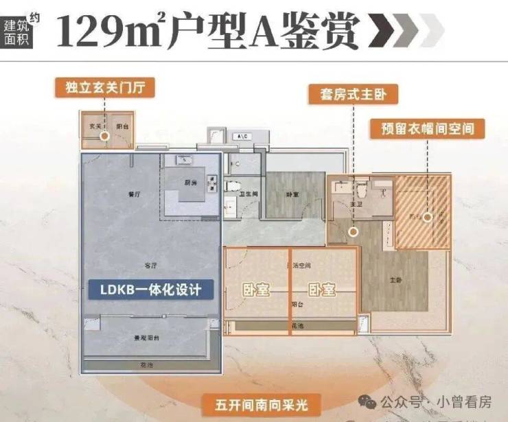 约129㎡户型B,四开间南向采光,客厅开间最高约达6米!搭配同为约6米的阳台,室内空间感直接撑大至IMAX级尊享!LDK餐客厅一体化,厅卧即可合并做成无界大方厅,也可以灵活设计成两个多功能间或次卧。