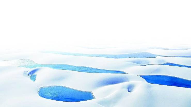 【环球时报特约记者 王逸】荒芜的沙漠配上虾兵蟹将生息的湖泊,形成沙水共存的极致景观。这处“世界上最湿润的沙漠”位于巴西东北部马拉尼昂州马拉尼恩塞斯国家公园,濒临大西洋海岸线50公里,占地面积1550平方公里,地形平坦,地势较低,最高的沙丘50米。有人叫它“千湖沙漠”(如图),也有人称它为“沙湖”。从空中俯瞰,连绵的半月形沙丘,像是一块块风干的白色亚麻布,因此当地人给了它一个更生动形象的名字——“马拉尼昂州的床单”。