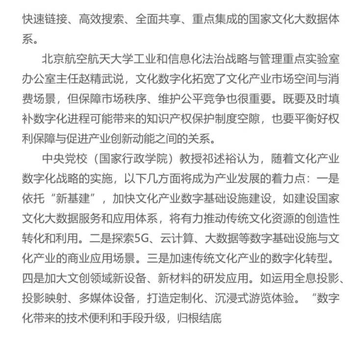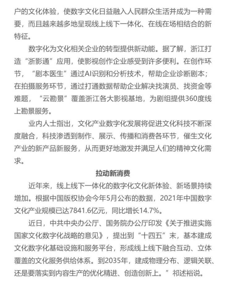 本周,中共中央办公厅、国务院办公厅印发《关于推进实施国家文化数字化战略的意见》,提出发展数字化文化消费新场景,大力发展线上线下一体化、在线在场相结合的数字化文化新体验。专家认为,“数字+文化”的发展新模式,将进一步增强中国公共文化数字内容的供给能力,提升中国公共文化服务的数字化水平。