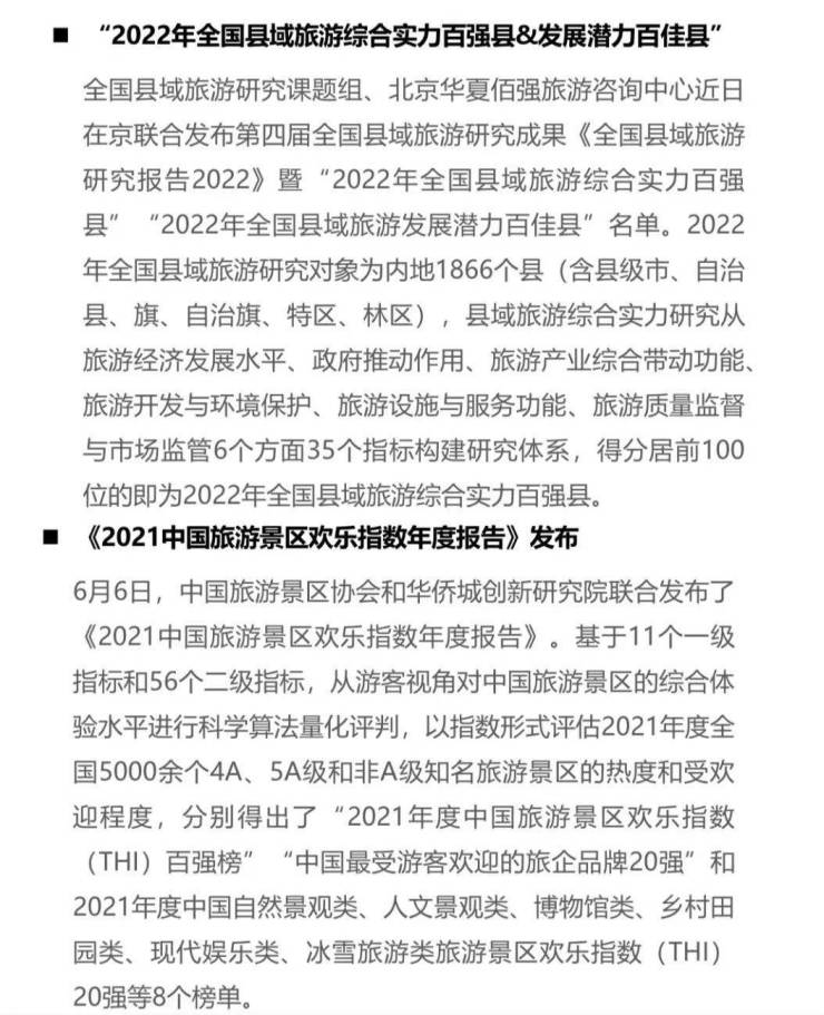 本周,全国县域旅游研究课题组、北京华夏佰强旅游咨询中心近日在京联合发布第四届全国县域旅游研究成果《全国县域旅游研究报告2022》暨“2022年全国县域旅游综合实力百强县”“2022年全国县域旅游发展潜力百佳县”名单。