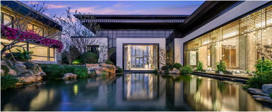 景粼原著传承古代**御用建筑形制,溯源中国古典建筑的屋脊、门廊、山墙、花窗、铺地等局部细节,融合西方现代设计演绎“新中式”的建筑精髓,首次采用合院类双拼化的别墅格局,东西入户且不占用院落空间,将生活的核心归还给院子,打造个性化居住体验的同时也保证了居住的私密性;地上三层和地下两层的格局可满足三代人各享生活空间,居住体验也更加舒适。
