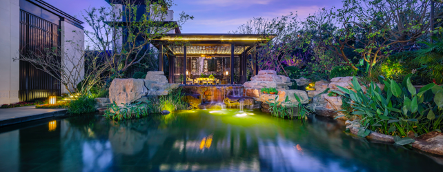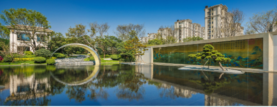 在园林景观上,景粼原著力求复原中国文脉山水园,独创 “八法二十四式”,运用相地、借景、叠石、理水等传统造园技法,以“一堂,两环,三园,四轴,十八巷”复原了中国古典园林之景,被誉为“中国别墅示范性园林”。 景粼原著遵循“以园为先,以礼造园”、“先造园,后造物”的造园理念和“园中园”式的设计布局,以园林作为联系人与建筑的纽带,让园林中的礼制融合在街巷、里弄、府院等空间场所中,将园林佳境散落分布其间,彰显东方的传统建筑艺术。