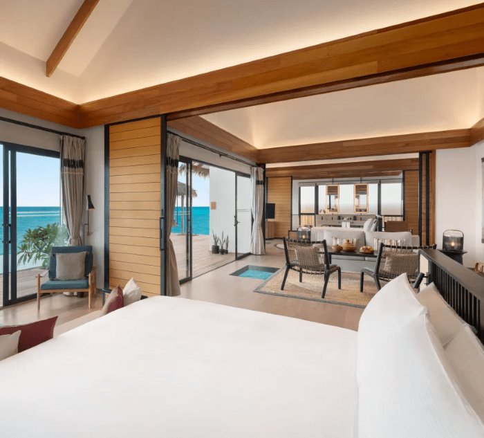 酒店有三种房型可以选择。爱巢水上别墅,沉浸在晶莹剔透的泻湖景色与时尚设计空间内,舒缓的白墙与温暖的木地板相呼应,窗外蔚蓝大海一览无余。阳光海滩泳池别墅位于葱茏的热带花园和棕榈树之间,隐私感十足,室内装修采用木制纹理和泥土红色调。阳光泳池水上别墅笼罩在印度洋的温暖拥抱中,并带有私人无边游泳池,以及特色的私人水上吊床和深浴缸。