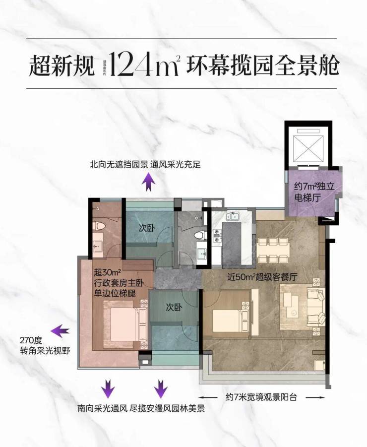 项目为100% 纯板楼、全南向、南北对流,无北向户型,户户四开间朝南,新规下使用率高达115%+,主力户型均为四房,圈层纯粹。