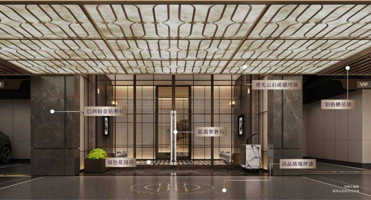 车库内部打造透光云石质感穹顶、铝格栅吊顶、高品质地坪漆、蓝翡翠奢石(局部)等豪奢配置。穿越奢华的归家路,际遇层峯的尊崇归家礼序。