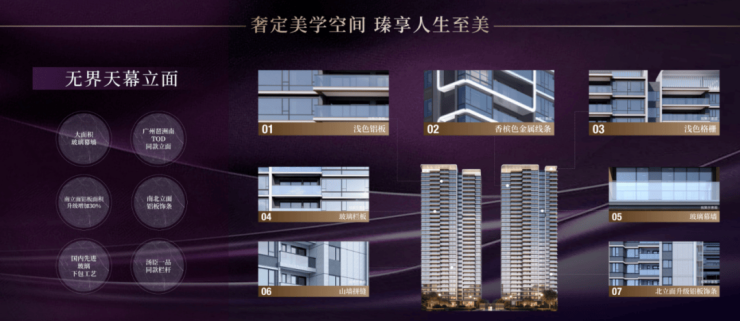 大面积MAX玻璃+金属铝板+汤臣一品同款栏杆,飘窗下沿采用国内先进玻璃下包工艺,搭配窄窗框及高窗墙比,带来超大屏的采光面和观景视野,以灵动曲线勾勒楼体线条,呈现出动态美感,惊艳于时代的品位。