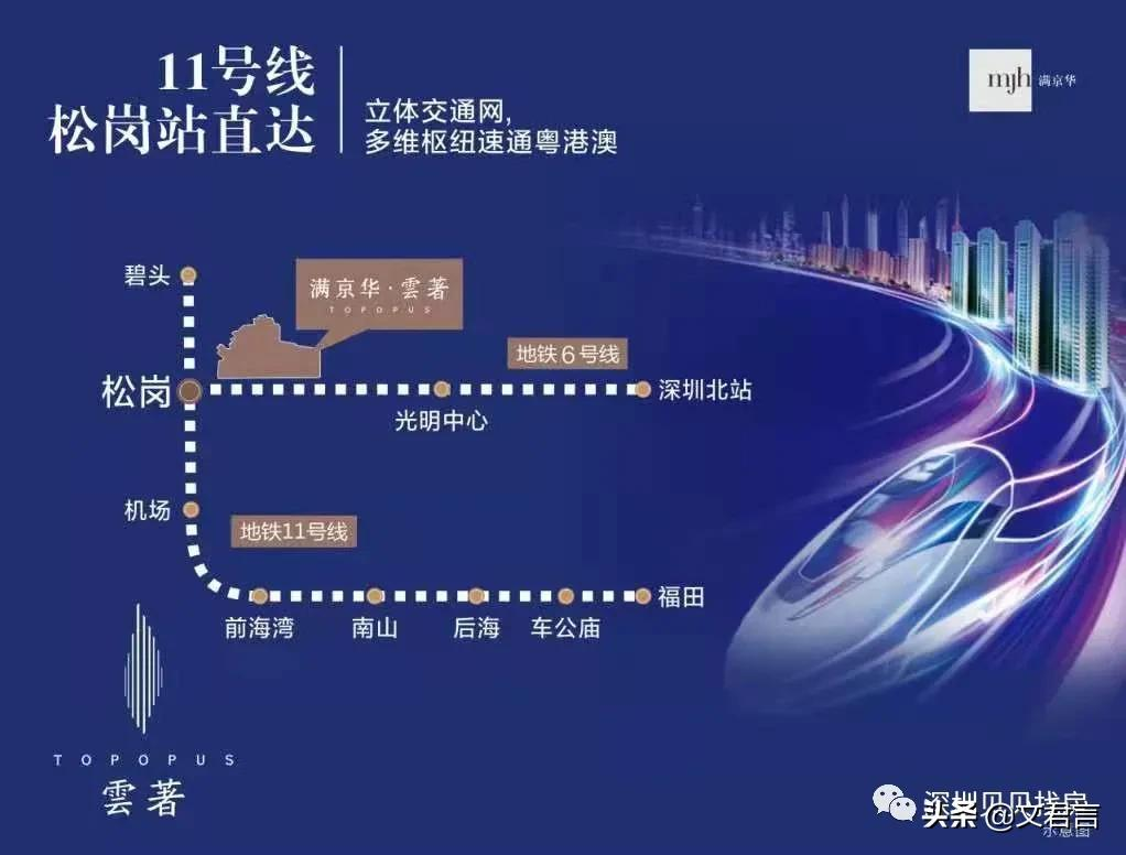 地铁交通方面,满京华云著雅庭距离最近的松岗站(11、6号线)步行约1.5公里,距离稍远,好在往来地铁站有社区微巴接驳,一定程度上方便了社区居民的出行。