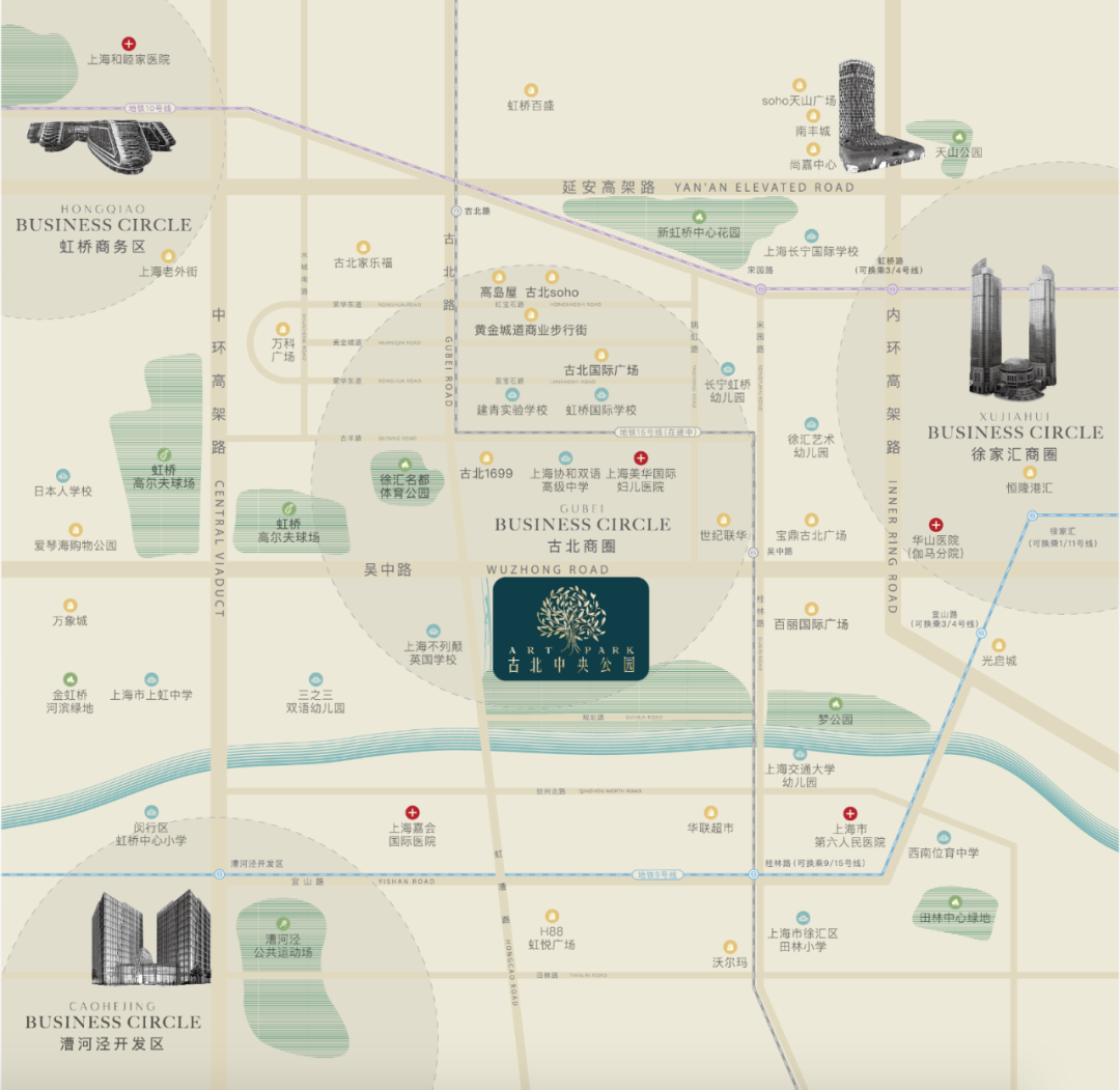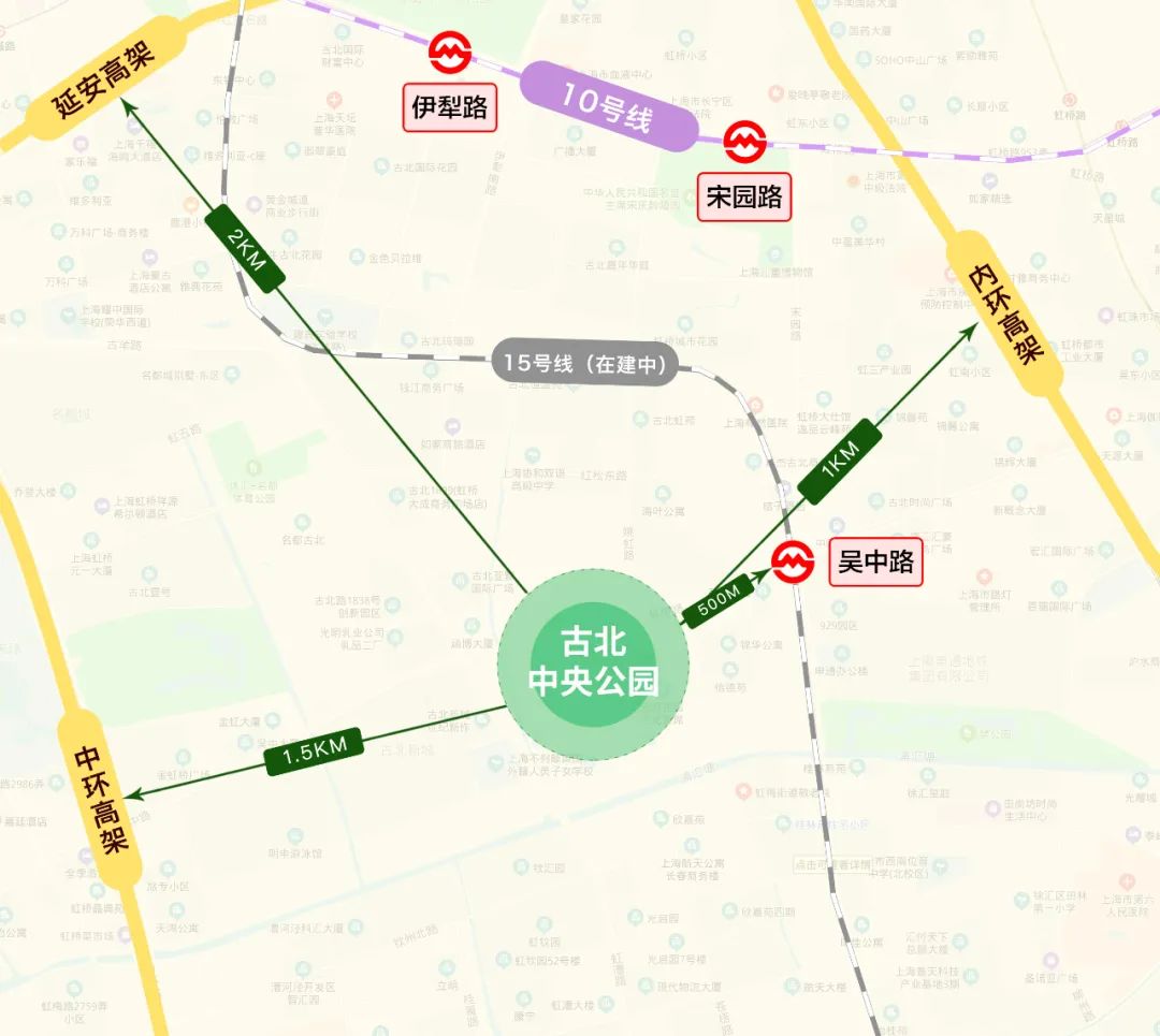 古北中央公园位于古北路、吴中路路口,周边配套成熟。项目距离15号线(在建)吴中路站仅约500米,步行可达。自驾出门即是吴中路,可快速连接徐家汇。